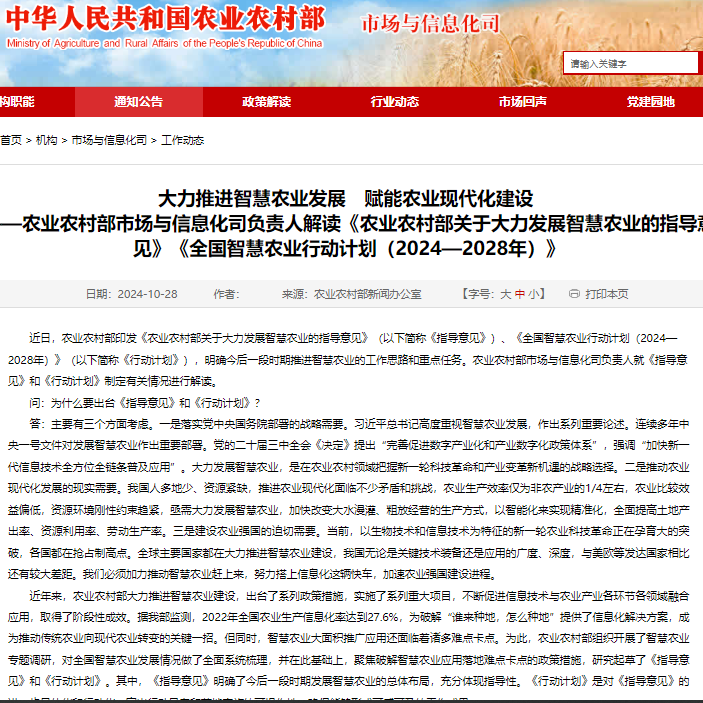 近日,農(nóng)業(yè)農(nóng)村部印發(fā)《農(nóng)業(yè)農(nóng)村部關(guān)于大力發(fā)展智慧農(nóng)業(yè)的指導(dǎo)意見》(以下簡稱《指導(dǎo)意見》)、《全國智慧農(nóng)業(yè)行動(dòng)計(jì)劃(2024—2028年)》(以下簡稱《行動(dòng)計(jì)劃》),明確今后一段時(shí)期推進(jìn)智慧農(nóng)業(yè)的工作思路和重點(diǎn)任務(wù)。農(nóng)業(yè)農(nóng)村部市場與信息化司負(fù)責(zé)人就《指導(dǎo)意見》和《行動(dòng)計(jì)劃》制定有關(guān)情況進(jìn)行解讀。 問:為 ...